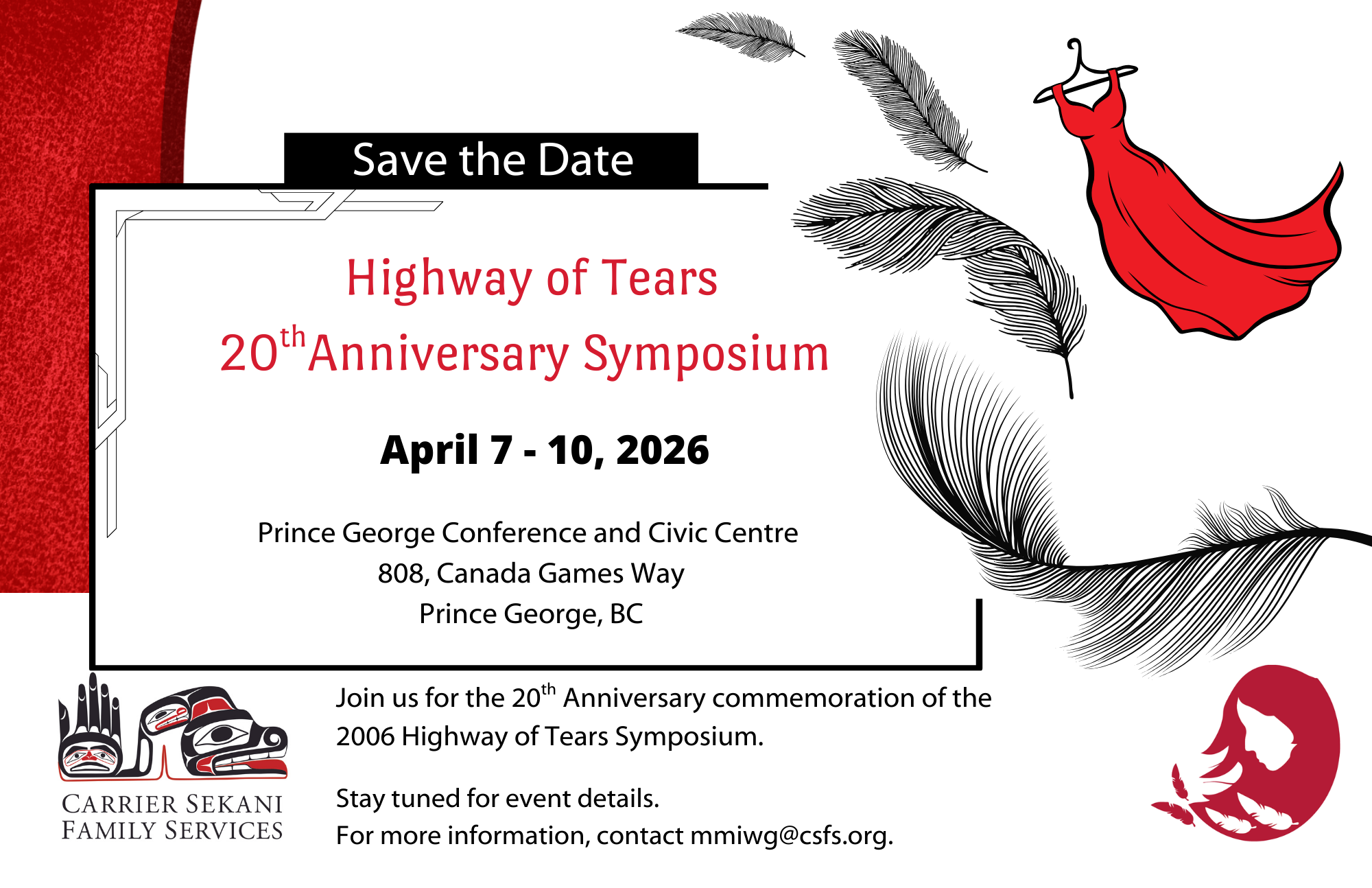 On April 7-10, 2026, Carrier Sekani Family Services (CSFS) will be hosting a 20th Anniversary Commemoration of the 2006 Highway of Tears Symposium at the Prince George Civic and Conference Centre.